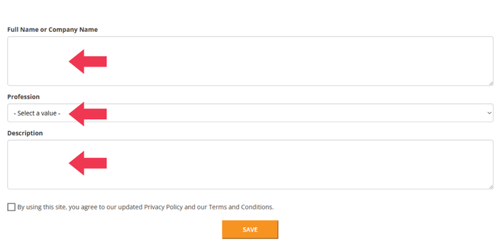 Enter the name as you would like potential clients to address you, indicating whether you are a company or an individual.