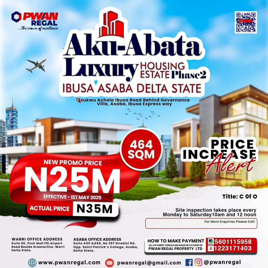 25,000,000 NGN Ibusa, Nigeria Vacant Land/Plot Aku Abata Housing Estate Phase 2 Contact seller Listed: 05/15/2025 Real Estate listed By: Real Estate Agent, PWAN REAL ESTATE COMPANY Share this Property Qroople Advertisers Advertise Here