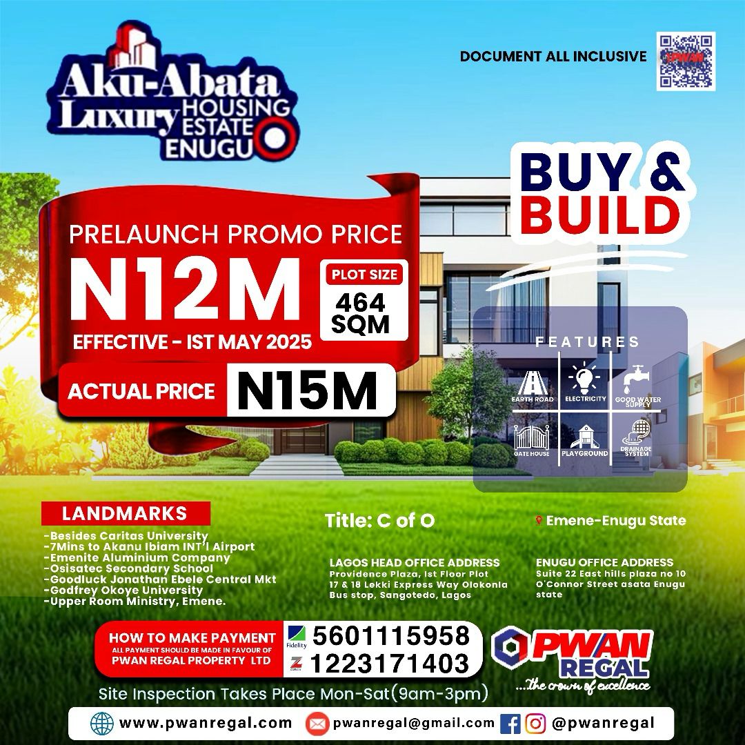 12,000,000 NGN Enugu, Nigeria Vacant Land/Plot Aku Abata Luxury Housing Estate Enugu Contact seller Listed: 05/02/2025 Real Estate listed By: Real Estate Agent, PWAN REAL ESTATE COMPANY Share this Property Qroople Advertisers Advertise Here