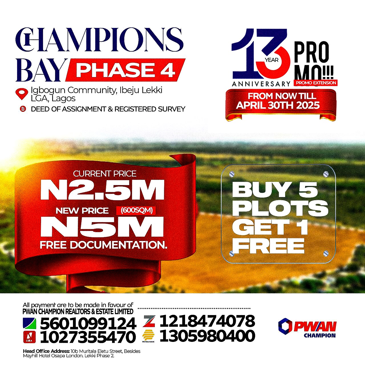 2,500,000 NGN Ibeju, Nigeria Vacant Land/Plot Champions Bay Phase 4 Contact seller Listed: 05/18/2025 Real Estate listed By: Real Estate Agent, PWAN REAL ESTATE COMPANY Share this Property Qroople Advertisers Advertise Here