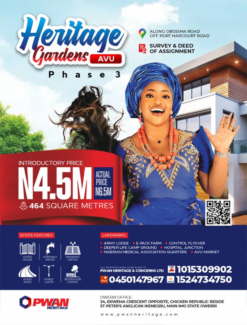 4,500,000 NGN Obosima, Nigeria Vacant Land/Plot Heritage Garden Phase 3 Gated House,Portable Water 💧, Drainage System,Good Roads,Street Light,Recreation Centre Contact seller Listed: 04/05/2025 Real Estate listed By: Real Estate Agent, PWAN REAL ESTATE COMPANY Share this Property Qroople Advertisers Advertise Here