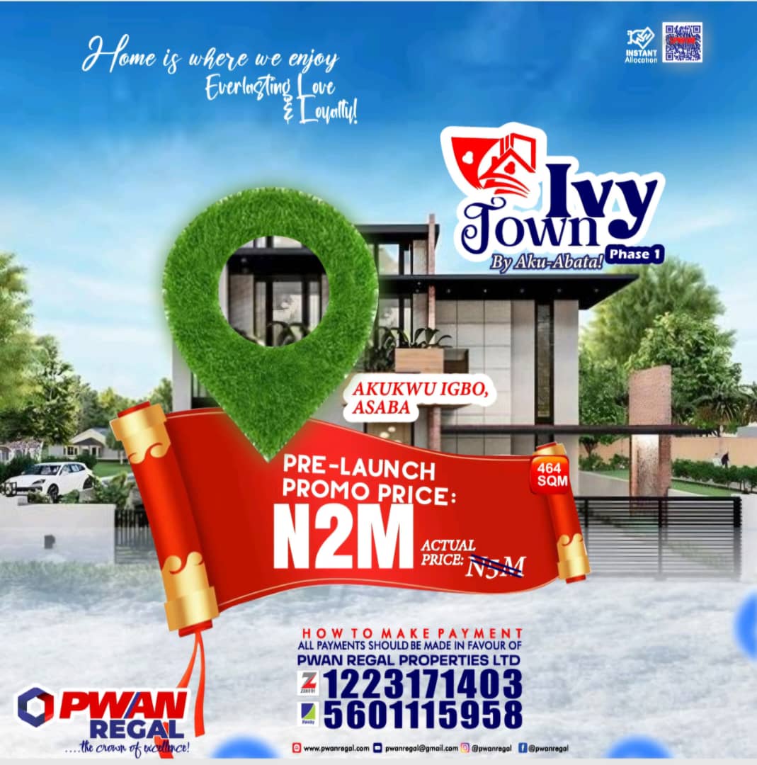 2,000,000 NGN Asaba, Nigeria Vacant Land/Plot Ivy Town by Aku Abata Phase 2 Contact seller Listed: 05/13/2025 Real Estate listed By: Real Estate Agent, PWAN REAL ESTATE COMPANY Share this Property Qroople Advertisers Advertise Here