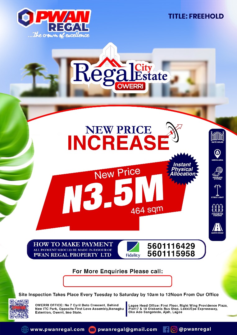 3,500,000 NGN Owerri, Nigeria Vacant Land/Plot Regal City Estate Owerri Contact seller Listed: 05/16/2025 Real Estate listed By: Real Estate Agent, PWAN REAL ESTATE COMPANY Share this Property Qroople Advertisers Advertise Here