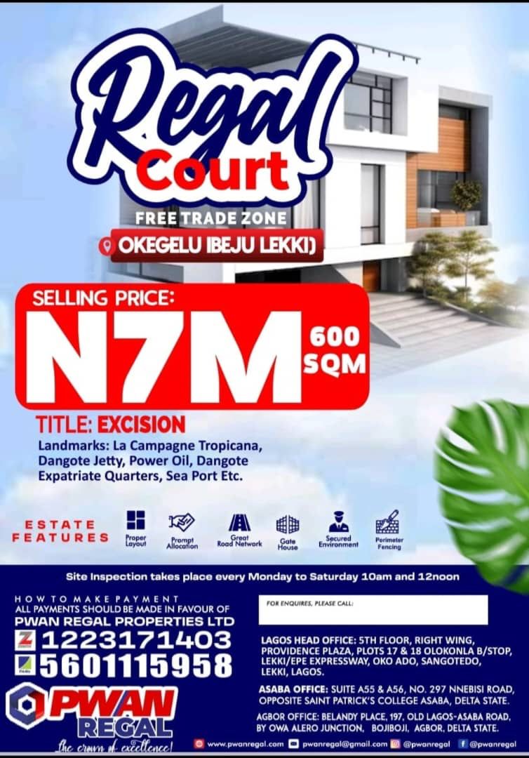 7,000,000 NGN Lekki, Nigeria Vacant Land/Plot Regal Court Phase 2 Contact seller Listed: 05/06/2025 Real Estate listed By: Real Estate Agent, PWAN REAL ESTATE COMPANY Share this Property Qroople Advertisers Advertise Here