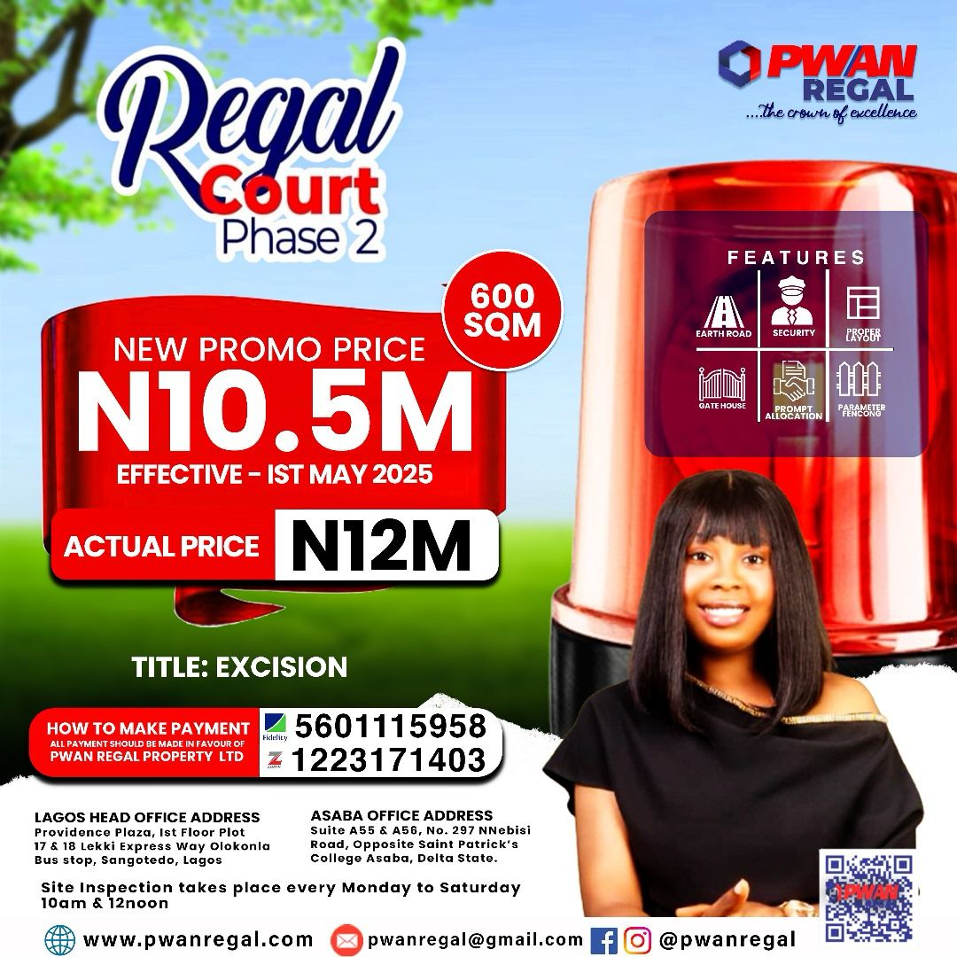 10,500,000 NGN Lagos, Nigeria Vacant Land/Plot Regal Phase 2 Contact seller Listed: 04/16/2025 Real Estate listed By: Real Estate Agent, PWAN REAL ESTATE COMPANY Share this Property Qroople Advertisers Advertise Here