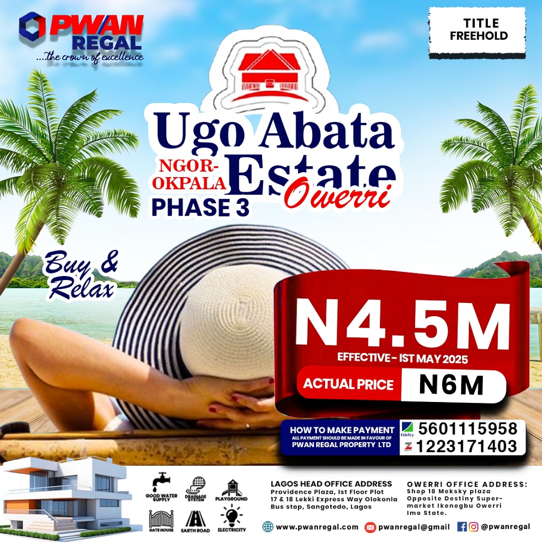 4,500,000 NGN Ngor, Nigeria Vacant Land/Plot Ugo Abata Estate Ngor Okpala, Owerri Good Water Supply 💧, Drainage System, Playground, Gate House,Electricity, Earth Road Contact seller Listed: 05/10/2025 Real Estate listed By: Real Estate Agent, PWAN REAL ESTATE COMPANY Share this Property Qroople Advertisers Advertise Here